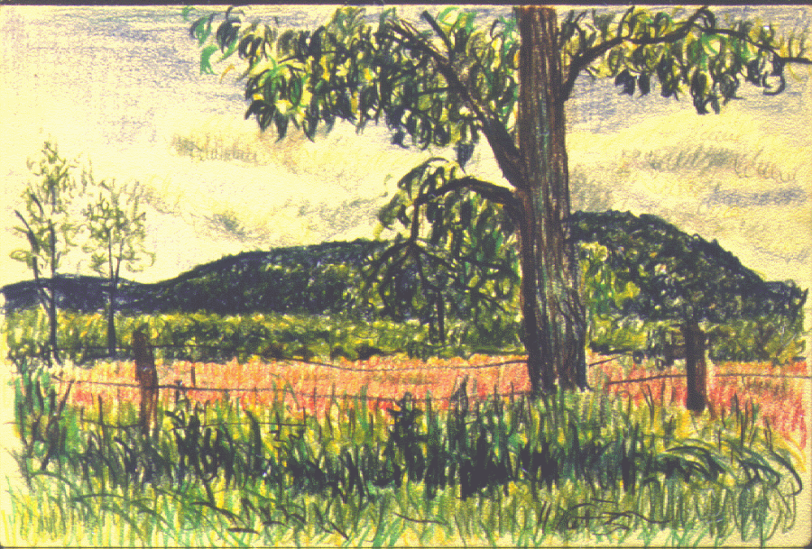 Watercolor painting by Lewis Mumford "Looking from the Rear of Our Leedsville House, July 2, 1944" from the Lewis Mumford Art Collection at Monmouth University.
